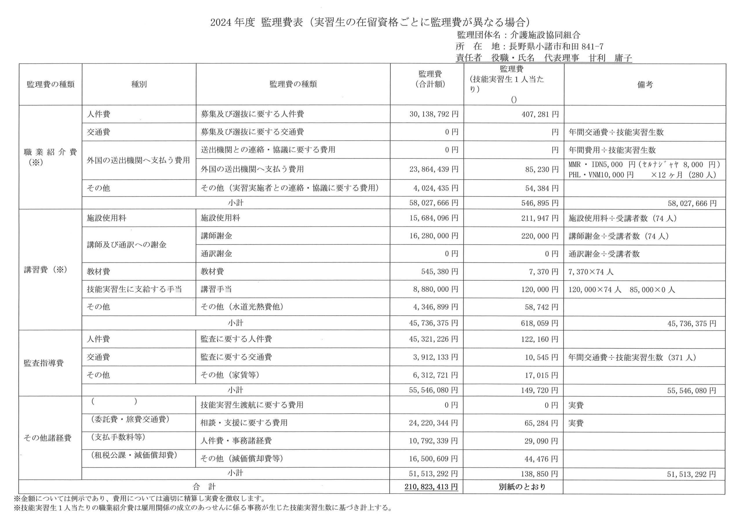 (送出し機関事前教育費、Nozomi Method受講費、入国渡航費、入国後講習費・寮費、健康診断費用等)